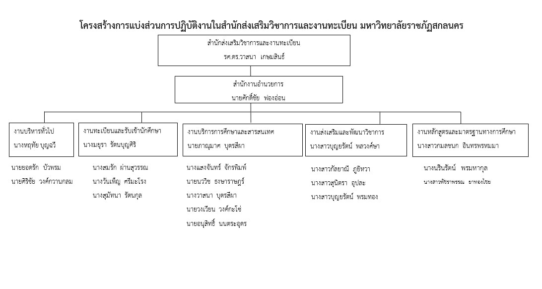 โครงสร้างส่วนราชการ ประกาศมหาวิทยาลัยราชภัฏสกลนคร เรื่อง การแบ่งส่วนราชการภายในมหาวิทยาลัยราชภัฏสกลนคร เป็นระดับงานหรือเทียบเท่างาน พ.ศ. 2561
